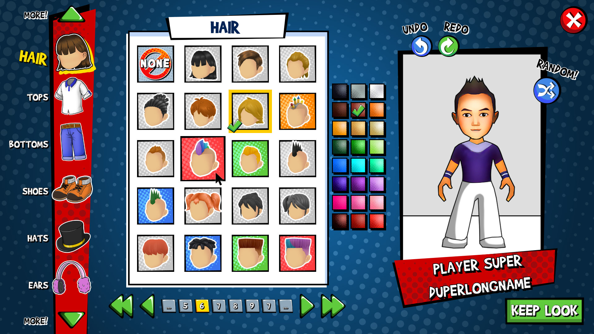 I moved the "Colors" panel to the right of the "Hair" panel. I noticed during play tests, players had difficulty or frustration when colors were on another page. So, I wanted to show all the colors at once, while allowing room for the selection to grow relatively large. However, it also had to look relatively normal if there were no colors at all.